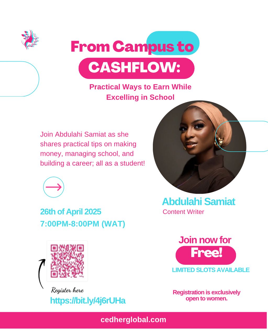 That’s why CedHER Global is excited to host a powerful training webinar titled “From Campus to Cash Flow,” featuring Abdulahi Samiat, an inspiring undergraduate, entrepreneur, and coach who’s helping young women unlock their full potential.
